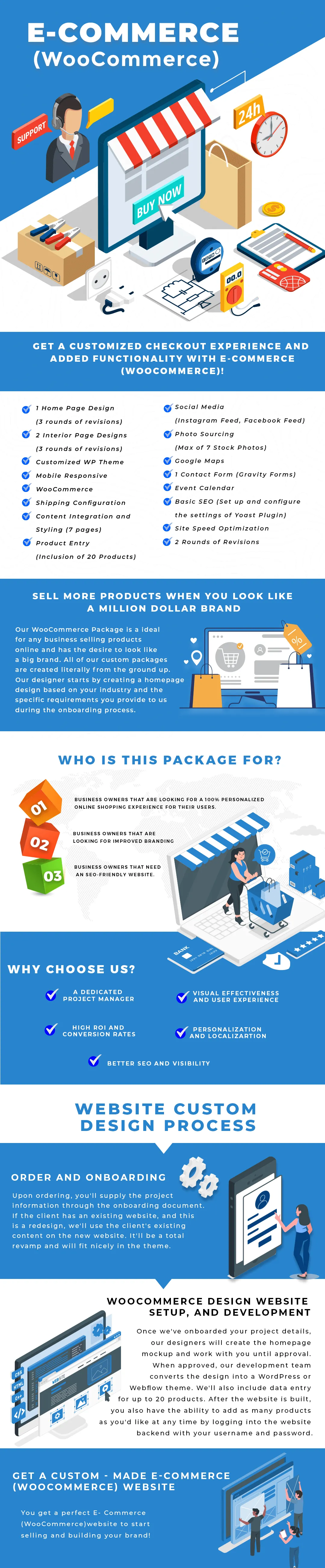 Our designer, creates the homepage, the main product pages, and the product description pages. When approved, we have our development team converts the design into a WordPress theme with WooCommerce.