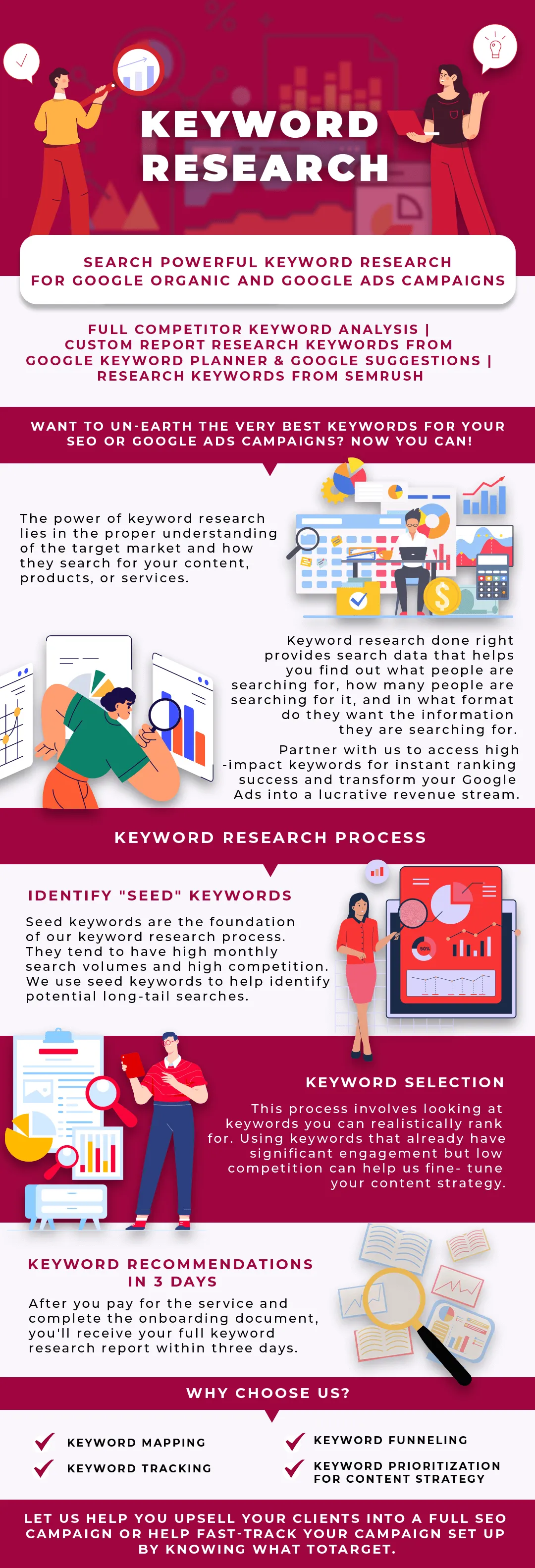 Get professional keyword research for Google Organic and your Google Ads campaigns. Use it to start a full SEO campaign or help fast-track your campaign set up by knowing what to target.