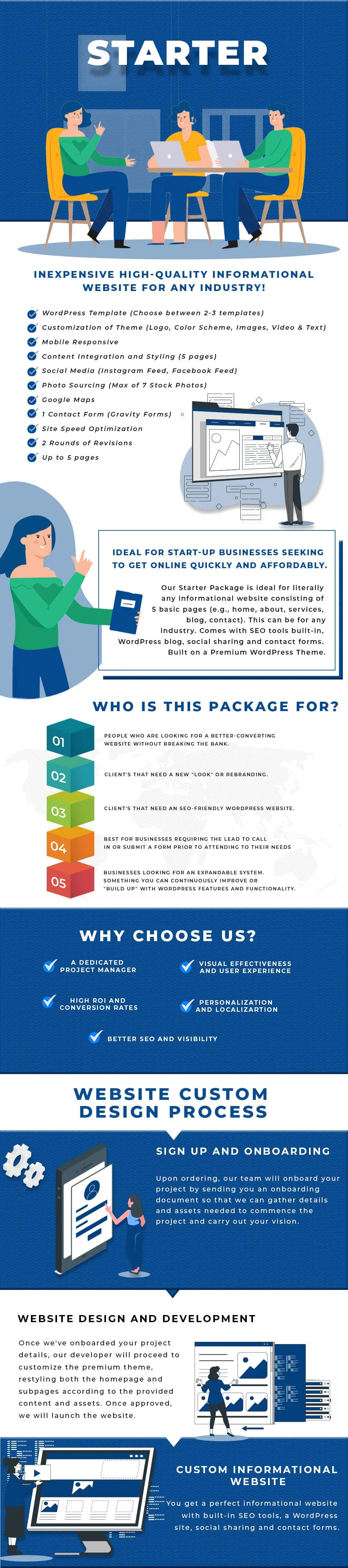 Our Starter Package is ideal for literally any informational website consisting of 5 basic pages (e.g., home, about, services, blog, contact). This can be for any industry. Our designers create all the assets to fit perfectly in the premium WordPress theme you've selected.